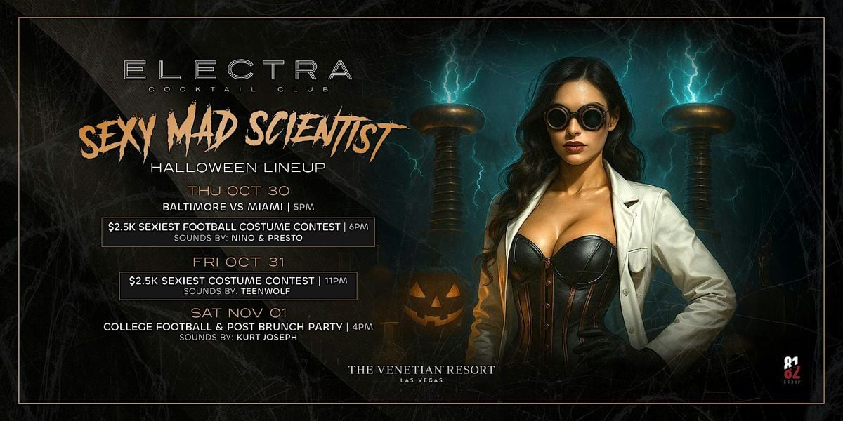 The Mad Scientist Halloween Party at Electra Cocktail Club at The Venetian promises a spine-chilling experience filled with live football, electrifying music, and hauntingly delightful cocktails. Known for its vibrant atmosphere and creative concoctions, Electra will transform into a realm of mystery and thrills.