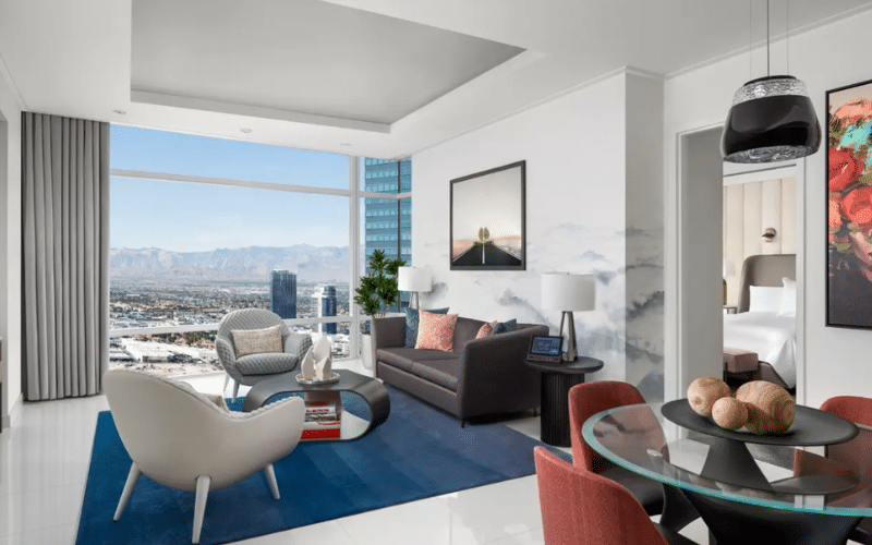 If you really want to have a “baller” Vegas experience, the Ultra Panorama 2 Bedroom Suite at Planet Hollywood is going to be your perfect bet. This 1,755 square-foot suite features a sweeping 180-degree Strip view from floor-to-ceiling windows and the kind of ultra-modern furniture you’d see in any movie about a wild trip to Vegas. A huge living space with wrap-around sofas, a white-and-gold color scheme, and a circular king-sized bed in the master bedroom will make you feel like a celebrity.
