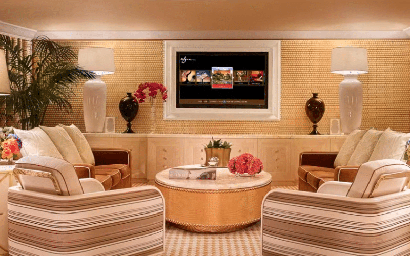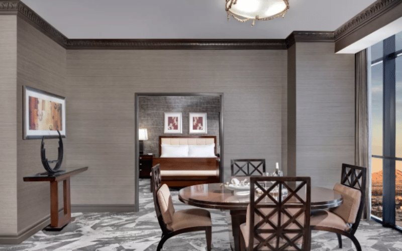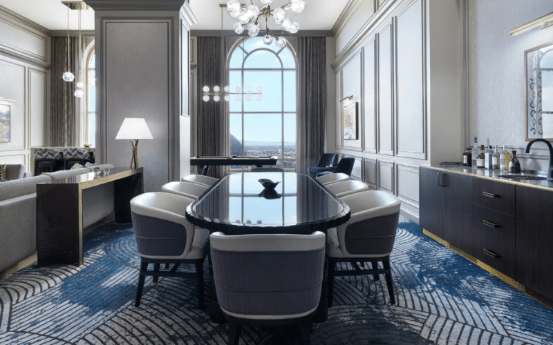 The New Corner Two Bedroom Suite is a stunning 2,800 square-foot space on the top floor of the resort and gives you an epic view of the Sphere. 15-foot ceilings, arched floor-to-ceiling windows, and classically stylish décor make this suite truly beautiful to behold. You’ll have 2 bedrooms, a huge living area, two dining areas, a pool table, and even a workout room.