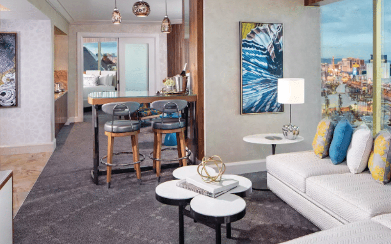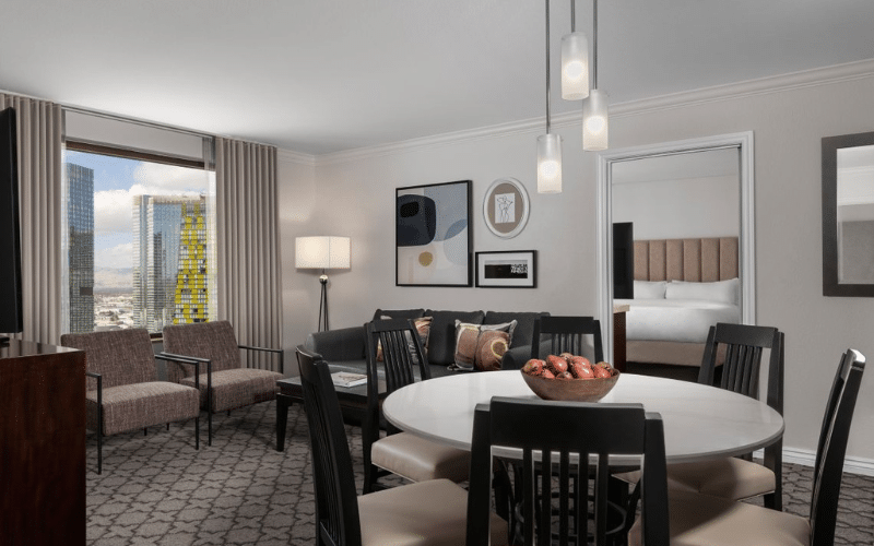 The City Suite Two Bedroom will give your group an experience of elite comfort and style. This 1,615 square-foot space features 2 bedrooms (one with a king and the other with 2 queens), as well as 2 and a half bathrooms. There’s a separate living room from the bedrooms, making the suite feel like a trendy apartment in the middle of the Las Vegas Strip. The overall layout is superb for entertaining while giving everyone their fair share of privacy. And man, what a view you’ll have!
