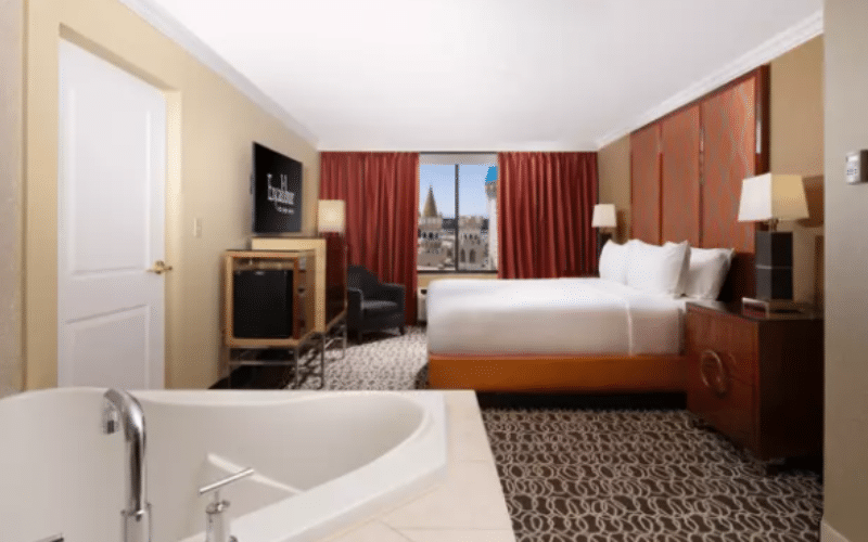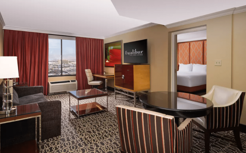 The Newly Renovated Resort Luxury Suite at Excalibur features a separate living room with a sofa, dining area with a table for two, and a 55-inch flat-screen TV. The bedroom has a comfortable king bed and opens onto a large bathroom with an oversized soaking tub for luxurious relaxation.