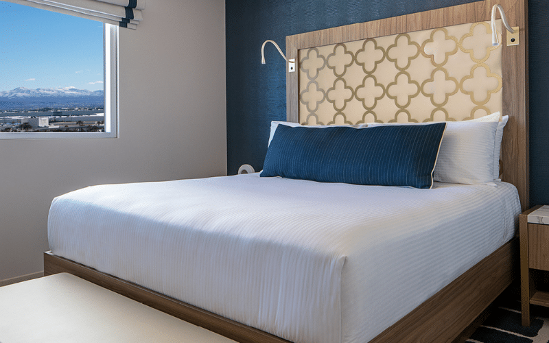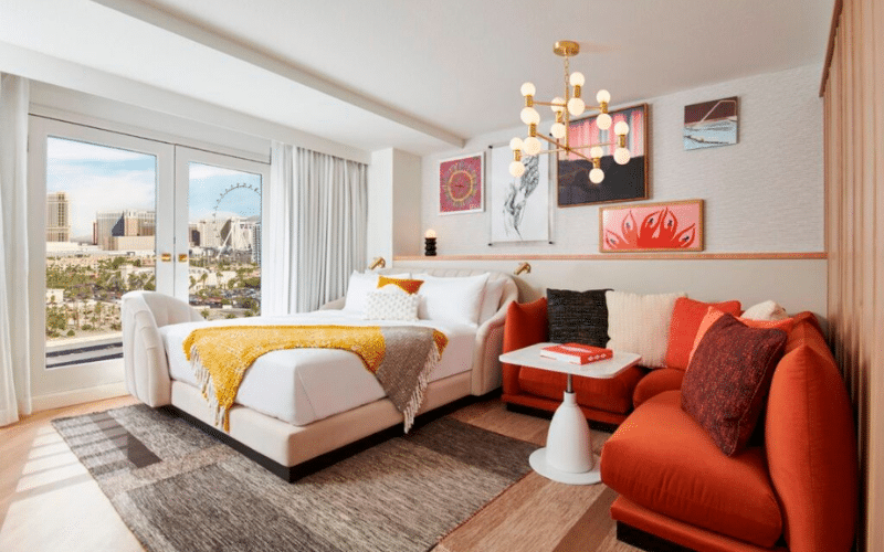 The Canyon King Deluxe Grand Chamber Suite at Virgin Las Vegas gives you 900 square feet of space with a separate living room and bedroom. The spacious living room features a stylish sitting area with a large HD TV, a dining table for four, and a minibar. In the bedroom, a patented ergonomically designed king bed will give you a great night’s sleep. Oh, and the Strip views are phenomenal in this suite.