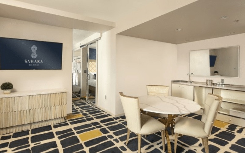 The Blanca One Bedroom Suite at SAHARA Las Vegas is 675 square feet with a separate bedroom and living room. The furnishing and décor in this suite combine retro charm with modern luxury. Rest easy on the Euro pillow top Serta Perfect Sleeper king bed, and stream your favorite movies on the 55-inch HD TV.