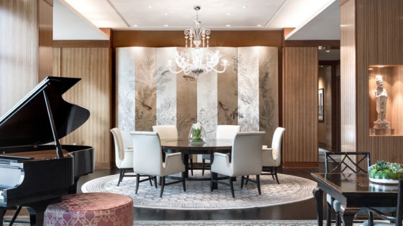 The opulent suite opens out to a secluded outdoor balcony, perfect for an al fresco meal ordered through in-room dining. A mahogany and granite 3-seat bar and a dining table for 6 allow for entertaining. You’ll even have a massage room for in-suite spa services.